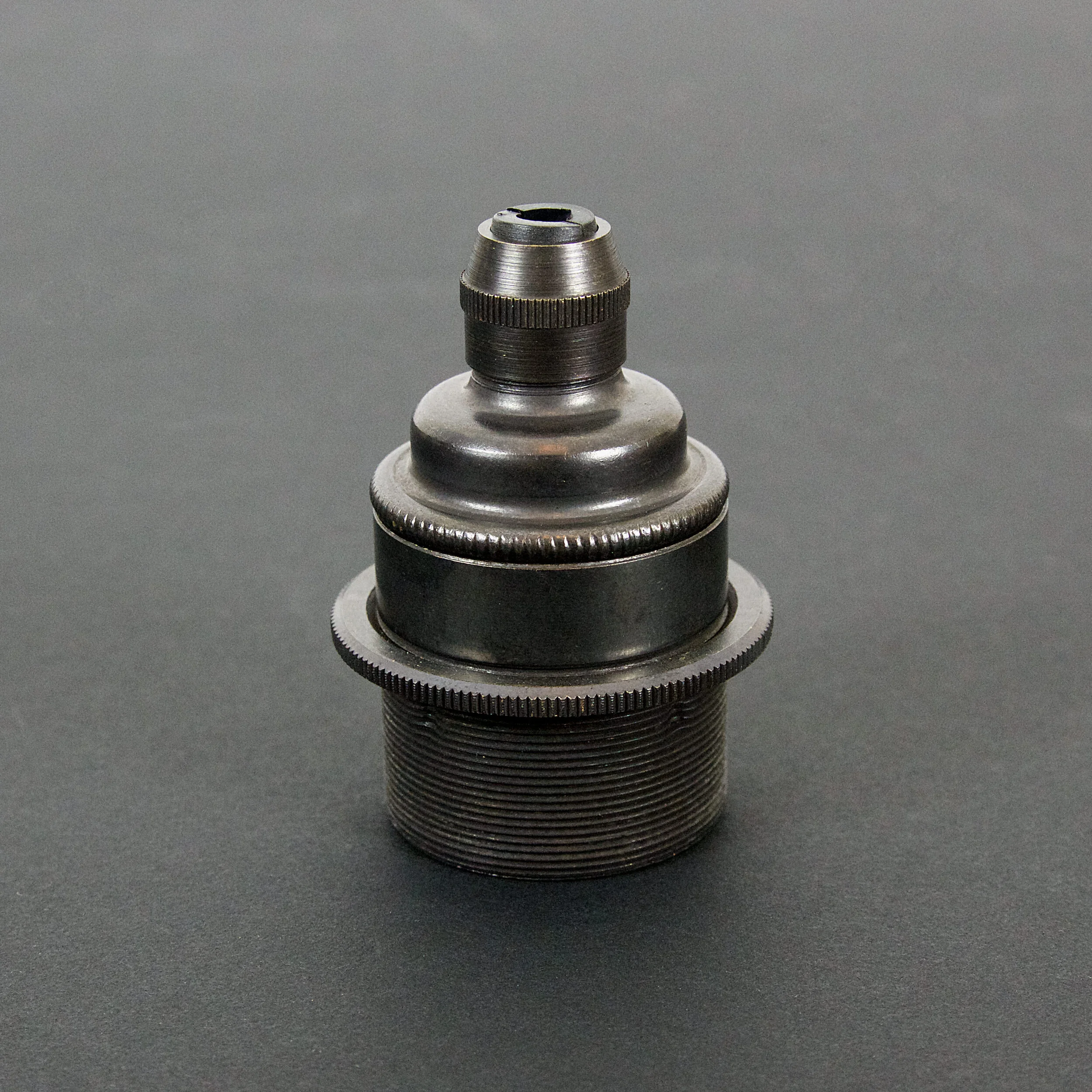 This light comes wired to one of our solid brass pendant lamp holders. These precision-machined fittings have a vintage-style bronze plating that beautifully compliments the black oxide steel finish of the shade.